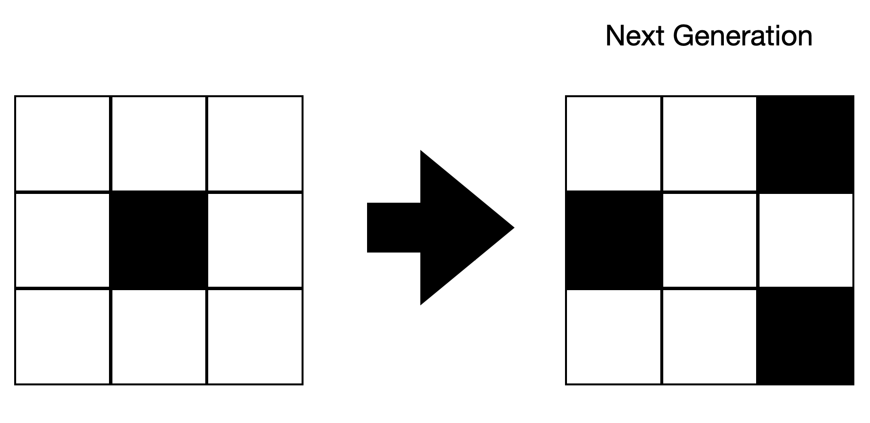 In each round (called a generation), it looks at all the cells and decides which ones need to change. Once all decisions are made, it updates all the cells at once—then repeats the process.