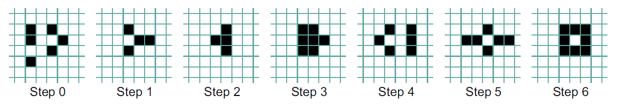 In most examples, dead cells are rendered white, while live cells are colored black.