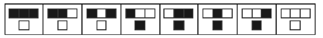 It displays one set of possible rules and the resulting, surprisingly complex pattern that is created by printing each new generation of the system under the previous one. It begins with one black cell and all the rest white.